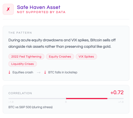 The pattern is consistent across crises. During acute equity drawdowns, Bitcoin’s correlation with risk assets rises, not falls. Portfolio managers looking for capital preservation during a VIX spike find Bitcoin wanting: its liquidity profile, 24/7 trading, and retail-heavy ownership base make it susceptible to rapid de-leveraging during exactly the moments when a safe haven asset should provide stability.