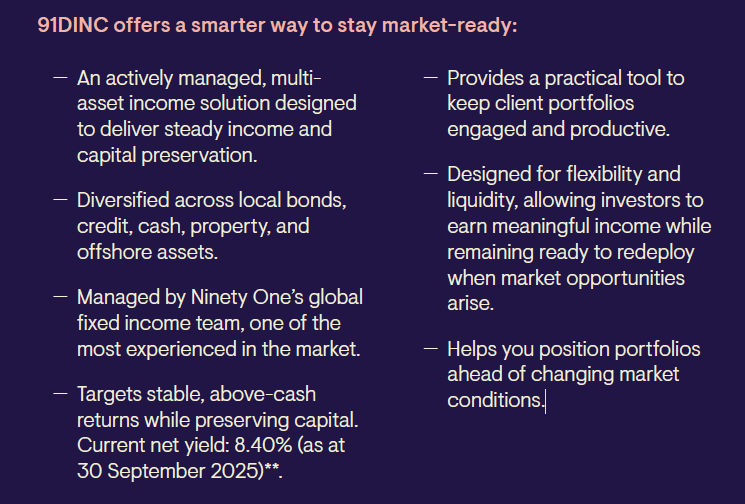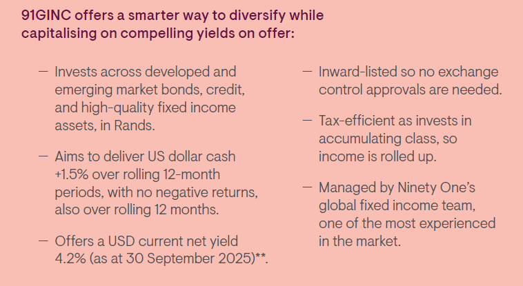 91DINC gives you access to Ninety One’s local multi-asset income strategy. It aims to deliver steady income with protection against downside risk. It spreads investments across local bonds, credit, cash, property and offshore assets, and it’s Regulation 28 compliant.
