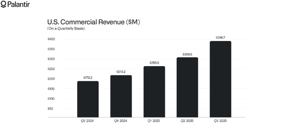 Palantir’s government business continues to perform strongly, reinforcing its role as a critical software supplier to US federal and defence agencies. The segment generated $486 million in revenue, growing 52% year-on-year, and continues to benefit from renewed budget allocations toward AI-enabled situational awareness, intelligence, and logistics.
