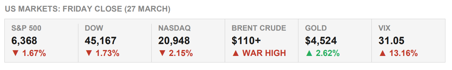 The Dow has slipped into correction, down 793 points. The S&P 500 is at a seven-month low, and the Nasdaq is close to 13 percent below its October peak. That is five straight weeks of losses, the longest run in almost four years, with stagflation back in the conversation.