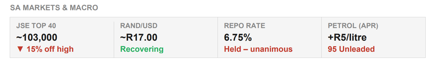 Locally, the picture is similar. The JSE Top 40 sits around 103,000, about 15 percent off its high. The rand has recovered to just below R17.00. The SARB held rates at 6.75 percent, but petrol is expected to rise by roughly R5 per litre in April.